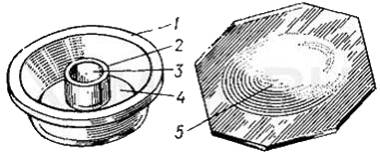 Прибор для микродиффузии (рис. 1) представляет собой небольшой круглый толстостенный сосуд 1 из стекла или пластмассы (наружный диаметр 60–70 мм, высота 10 мм). Внутри этого сосуда расположен второй круглый сосуд 2 меньшего размера (диаметр 30–35 мм, высота 5 мм). Таким образом, в приборе для микродиффузии имеется внутренняя круговая 3 и наружная кольцевая 4 камеры. Верхний край наружной камеры должен пришлифовываться так, чтобы к нему плотно прилегала крышка 5.