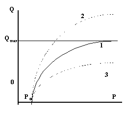 Рисунок 1. Проекции поверхностей предложения на плоскость цена-объем при разном влиянии инфляции