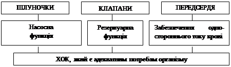 Односторонність току крові забезпечується, завдяки певному “напрямку” градієнта тиску в системі (від аорти до порожнистих вен градієнт біля 100 мм рт. ст., від легеневого стовбура до легеневих вен – близько 20 мм рт. ст. Ù в такому напрямку рухається кров судинами). Якщо в системі виникає ситуація, коли кров за градієнтом тиску має рухатися в протилежному напрямку (наприклад, вени, що розташовані нижче рівня серця при вертикальній позі людини), зворотньому руху крові перешкоджають клапани. Аналогічно функціонують клапани серця: перешкоджають руху крові в передсердя із шлуночків під час систоли (скорочення) останніх; з аорти та легеневого стовбура в шлуночки під час їх діастоли (розслаблення).