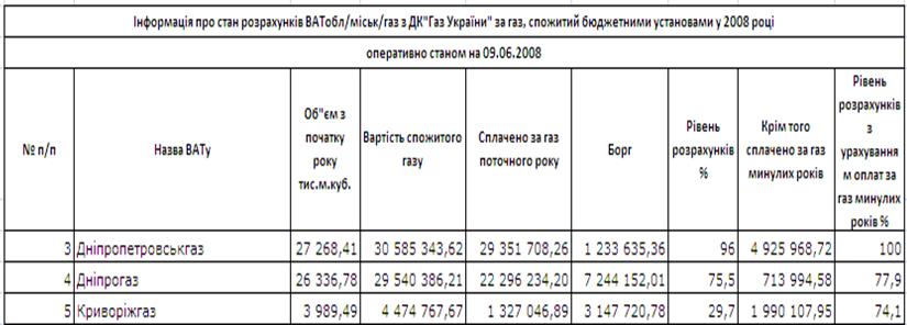 Рівень оплати у 2008 році за постачання газу у Дніпропетровській області бюджетними установами по конкуруючим компаніям ВАТ «Дніпропетровськгаз», ВАТ «Дніпрогаз», ВАТ «Криворожгаз»