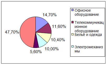 Диаграмма №1 показывает структуру экспорта Китая: 14,7% от общего экспорта (87,1 млрд. долларов) приходится на офисное оборудование; 11,6% (68,5 млрд. долларов) – телекоммуникационное оборудование;10,4% (61,9 млрд. долларов) – бельё и одежда; 10,0% (59,5 млрд. долларов) – электромеханизмы; 5,6% (33,4 млрд. долларов) – текстиль и прочие статьи экспорта.