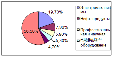 Диаграмма № 2 показывает структуру импорта КНР, в котором 19,7% от общего объёма импорта (110,5 млрд. долларов) приходится на электромеханизмы; 7,9% (44,5 млрд. долларов) – на нефтепродукты; 5,9% (33,3 млрд. долларов) – на профессиональную и научную аппаратуру; 5,3% (29,6 млрд. долларов) – на офисное оборудование; 4,7% (26,3 млрд. долларов) – на прочие механизмы и пр.