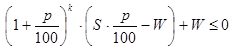 Отсюда, прежде всего, вытекает, что с долгом удастся расплатиться, если S×p/100<W, то есть его увеличение за первый период должно быть меньше разового платежа. Впрочем, это было ясно и из предыдущих рассуждений. Далее, последнее соотношение говорит о том, что при S×p/100<Wдолг будет погашен через k периодов, где k- наименьшее натуральное число, удовлетворяющее неравенству: