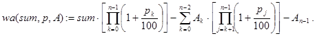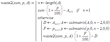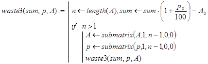 Решение. Данная задача весьма похожа на задачу 1. Рекурсивная программа-функция waste(sum,p,A,n) реализует декомпозицию, исходя из такого утверждения. Положить сумму sum в банк на n периодов со снятием в конце каждого периода по A денежных единиц – это то же самое, что положить данную сумму на тех же условиях на n – 1 период, взять, снова положить на 1 период и затем снять A единиц.
