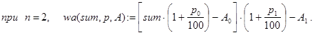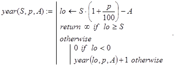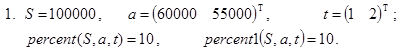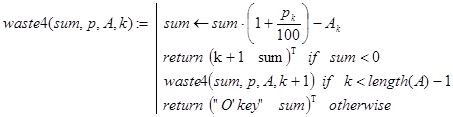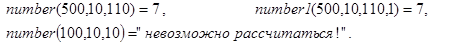с некоторым вспомогательным натуральным аргументом k. Ясно, что при обращении к ней с любыми значениями S, p и W (S×p/100<W) и k=1 получим решение исходной задачи. Обратите внимание на отсутствие отложенных вычислений при реализации number1(S,p,W,k).
