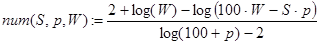 (логарифм десятичный) и взять наименьшее целое, большее или равное num(S,p,W).