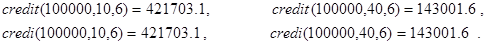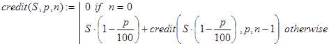 Решение. Получить решение данной задачи можно по рекурсивной функции credit(S,p,n). Декомпозиция в ней реализована, исходя из следующей посылки. Суммарная величина кредитования всей системы банков складывается из величины кредитования банка B1 и суммы величин кредитования остальных банков с учетом того, что вклад в банк B2 составил S×(1-p/100) денежных единиц. База рекурсии также очевидна: нет банков (n=0) - нет кредитования.