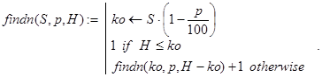 Решение. Здесь, как и в предыдущей задаче, не предполагается, что все банки Bk (k=1,2,...,n) различны. Поэтому фактически речь идет не о минимальном количестве банков, обеспечивающих кредитование, не меньшее заданной величины H, а о минимальном количестве (оперативных) возвратов в банки денег, отдаваемых в кредит. Но нам удобней вести речь о количестве банков. Прежде всего, из общей формулы (40) вытекает, что данная задача не всегда имеет решение. При бесконечной системе банков предельная сумма кредитования равна L(S,p) = (S×100/p) ×(1-p/100). Поэтому решать задачу можно лишь при условии H<L(S,p). Найти n можно, как наименьшее натуральное решение неравенства