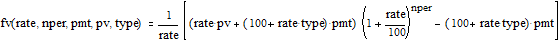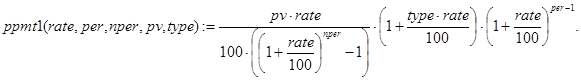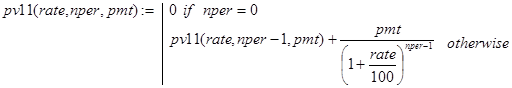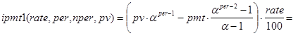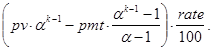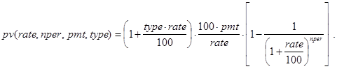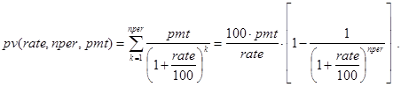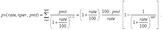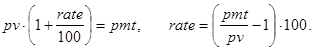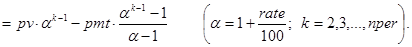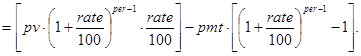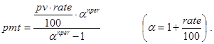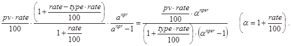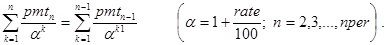 На последнее соотношение можно смотреть как на декомпозицию исходной задачи с прежними платежами и процентной ставкой, nper-1 периодом и инвестициями в pv×(1+rate/100) -pmt денежных единиц. Правда, инвестиции здесь содержат неизвестный параметр rate. Далее ясно, что при nper=1
