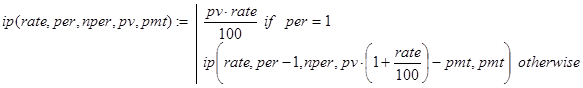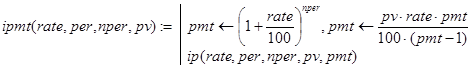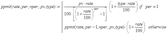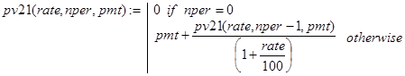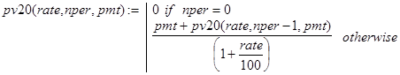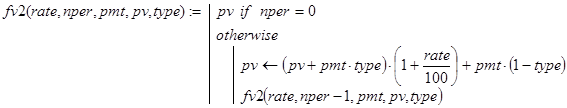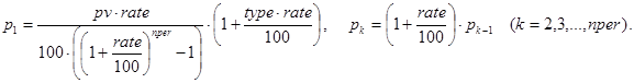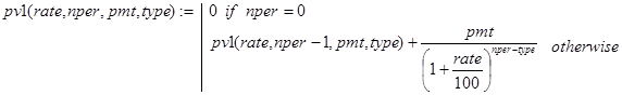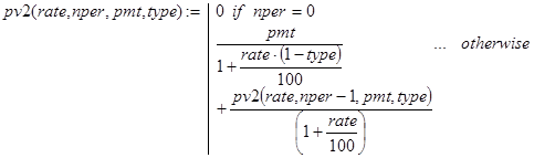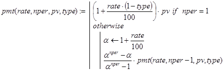 Решение. Данная задача может быть решена с помощью встроенной в Excel функции rate(nper,per,pv,type). Строя рекурсивные аналоги rate(), будем делать это отдельно для случаев type=0 и type=1.