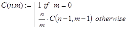 C(n,m) - вычисление количества сочетаний из n элементов по m элементов. Декомпозиция в рекурсии организована в соответствии с известной формулой: