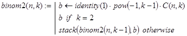 binom2(n,k) - вычисление последовательности биномиальных коэффициентов со знаком Декомпозиция в рекурсии организована по величине аргумента s. База рекурсии соответствует значению s=2.