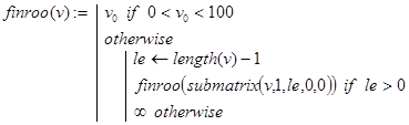 finroo(v) - нахождение в векторе v первой из компонент t, удовлетворяющей условию (Im(t) =0) ×(Re(t) Î(0,1)). Если таковых компонент не имеется, то возвращается значение, равное ¥. Декомпозиция в рекурсии организована по значению длины меняющегося вектора v.