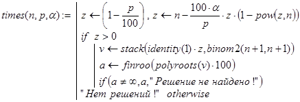 times(n,p,a) - с помощью функций pow(), С() и binom2() находится вектор v коэффициентов (43) многочлена (42). После этого с использованием встроенной функции polyroots(v) отыскиваются корни многочлена (42). При написании программы-функции times(n,p,a) учтено утверждение критерия существования решения задачи, сформулированное ниже в виде леммы 1: