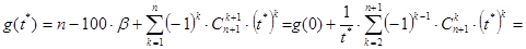 Доказательство. Необходимость. Пусть решение x исходной задачи существует. Тогда, как мы уже отмечали, его следует искать среди действительных корней многочлена g(t) (t=x/100 Î (0,1)). Нам понадобится значение g(t) в нуле: g(0) =n-100×b. Пусть t*Î(0,1) - корень g(t). В этом случае