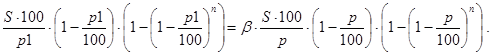 Пусть в банк B1 внесен вклад в S денежных единиц. Будем считать, что свободные резервы банка Bk (k=1,2,...,n-1) в результате ряда операций становятся вкладом в банк Bk+1 (k=1,2,...,n-1), а норма обязательных резервов равна p процентов. Определить суммарную способность к кредитованию рассматриваемой системы банков.
