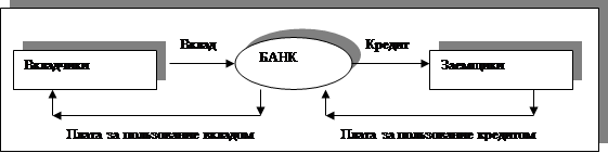 Большой выбор содержательных задач, решаемых финансовыми функциями, можно встретить в сфере банковской деятельности [1,3-6]. Причем возникают они здесь на обслуживании всего лишь двух операций. Банк, являясь финансовым посредником между вкладчиками и заемщиками (рис.1), с одной стороны, принимает деньги и платит по ним проценты, а с другой стороны, дает кредиты и получает за них проценты. Разность между той суммой, которую получает банк от заемщиков по процентам за конкретный период, и той, которую он платит вкладчикам по процентам за этот же период, и составляет прибыль банка. Как говорил американский писатель-сатирик Генри Уилер Шоу [2, с.30] “Банковский процент не знает ни отдыха, ни богослужений, он работает и по ночам, и в воскресенье, и даже в дождливые дни”.