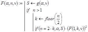 где a- действительное число, n- натуральное число, v=(v1,v2,…,vs) T- вектор с числовыми компонентами, g(a,v) - функция, значения которой для a и v из области определения F(a,n,v) мы вычислять можем. Тогда рекурсивная программа-функция: