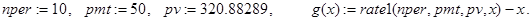 где за x обозначена величина rate(nper,pmt,pv). Мы получили, что в процессе рекурсивных вызовов функция обращается к самой себе с тем же самым набором значений параметров. Ясно, что вычисления по ней не будут иметь останова. Точнее, останов будет аварийным по переполнению стека. С подобной ситуацией мы уже сталкивались при решении задачи 10. И там для выхода из создавшейся ситуации был использован прием введения дополнительного параметра. Поступим также и здесь, заменив (33) функцией: