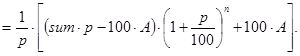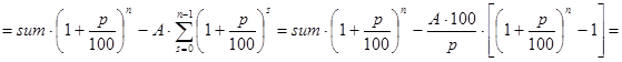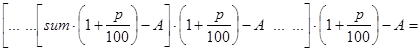 Вкладчик положил в банк сумму в sum денежных единиц под p процентов за один период времени. В конце каждого периода вкладчик после начисления процентов снимает со счета A денежных единиц. Определить сумму вклада через n периодов времени.