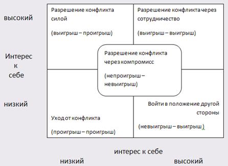 Если на основе двух переменных (интерес к себе и интерес к другим) построить матрицу, то, измеряя в каждом из случаев "интерес" как низкий или высокий, можно наглядно выделить стили разрешения межличностного конфликта (приложение 1).