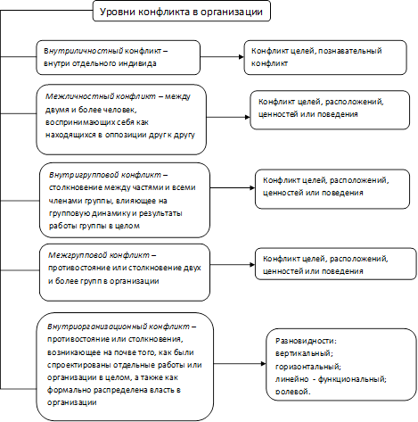 На основе анализа уровней организационного взаимодействия выделяют пять уровней конфликтов в организации: