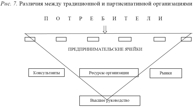 · Партисипативная – организация, использующая участие работников в управлении. Тем самым обеспечивается мотивированность их труда. Обостряется чувство собственника. В таких организациях работники могут: