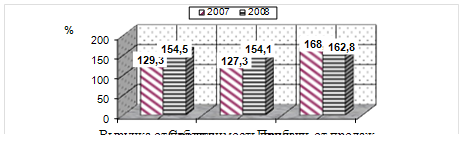 1. В 2008 г. рост выручки от продажи составил по сравнению с 2007 г. 17523 тыс. руб. или 19,6%. В 2008 г. по сравнению с 2007 г. прибыль от продаж снизилась на 195 тыс. руб., или 3,6 %.