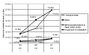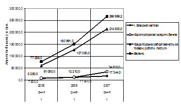 Таким чином, для 2006 року для активів підприємства характерні процеси практично повного використання грошових коштів підприємства, при цьому 44,4 % активів займає дебіторська заборгованість за реалізовану продукцію, а 44,1 % активів – запаси, тобто розвиток підприємства залежить від надходжень-ня коштів від реалізації для придбання в запаси наступної партії продукції.