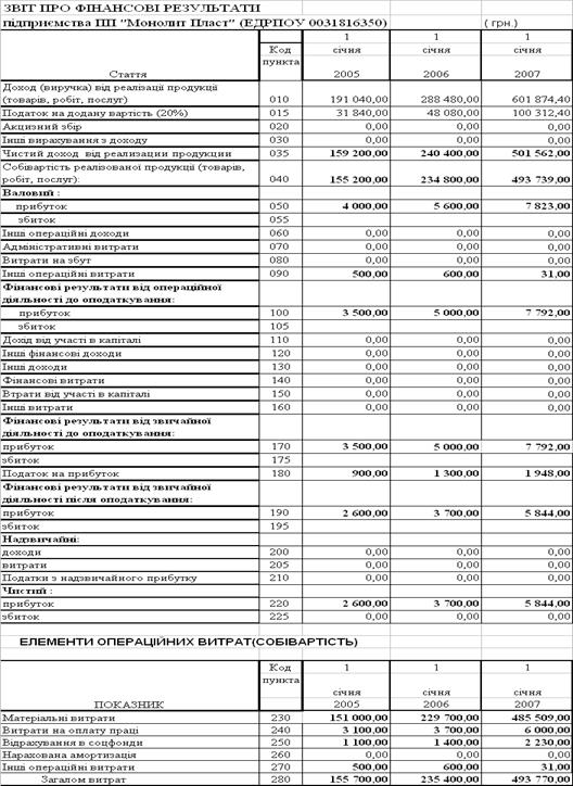 Аналіз результатів первинної статистичної обробки звітів про фінансові результати підприємства ПП "Монолит Пласт" за 2004 –2006 роки показує: