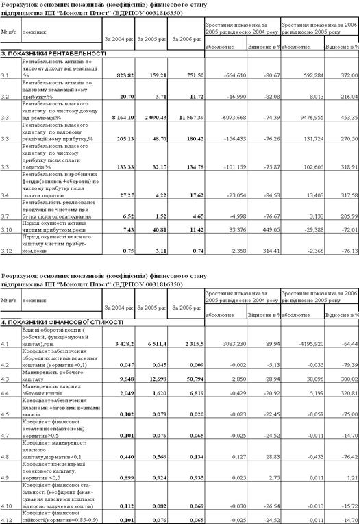 Аналіз результатів вторинної (коефіцієнтної) статистичної обробки ба-лансових звітів та звітів про фінансові результати діяльності ПП "Монолит Пласт" за 2004 – 2006 роки показує, що у ПП "Монолит Пласт":