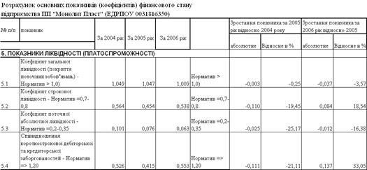Таким чином, у 2004 – 2006 роках підприємство ПП "Монолит Пласт" почало і продовжує свою діяльність в в кризовій полосу неліквідності балансу в короткострокових та довгострокових періодах, що зафіксовано у раніше вказаному факті використання у 2004 - 2006 році грошової маси на закупівлю товарних запасів.