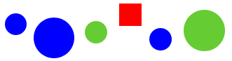 Материал: набор фигур - пять кругов (синие: большой и два маленьких, зеленые: большой и маленький), маленький красный квадрат.
