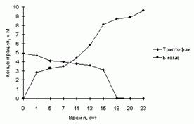 С, что служит положительным фактором в пользу анаэробного сбраживания органического вещества этого вида сырья метаногенным консорциумом микроорганизмов. [8]. Потребление аминокислоты метаногенным консорциумом микроорганизмов, т.е. практически полное разложение триптофана, как видно на рисунке, происходит в течение 18 суток и выходе биогаза свыше 10 мМ. На основании исследований установлено, что этот процесс происходит вначале с разложением линейной цепи, а затем деградации ароматического кольца аминокислоты.