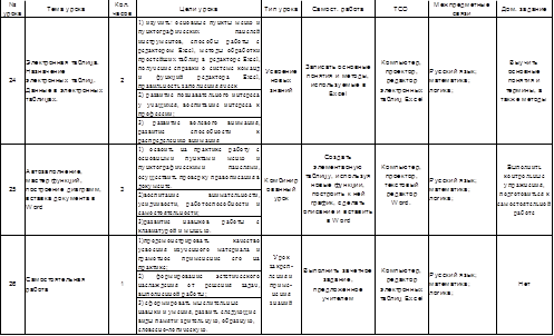 Изучение темы "Редактор электронных таблиц MicrosoftExcel" по времени занимает не менее 6 часов с учетом проведения практических работ по усвоению и закреплению лекционного материала. Кроме того, ученикам предлагается задание на дом, но небольшое, которое позволит самостоятельно изучить одну – две функции редактора Excel. Также ученикам дают задание повторить изученный материал, и на следующем занятии проводится тест.