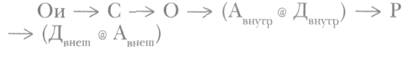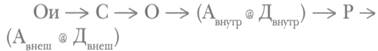 Применение деятельностного подхода в теории познания, разработанное философами, психологами и педагогами, как раз и является, на наш взгляд, конкретизацией теории отражения применительно к исследованию многообразных механизмов формирования и развития научного знания; позволяет видеть, как формируются, совершенствуются и развиваются представления человека о мире и его месте в нем; дает возможность за знанием как результатом обнаружить механизмы познавательной деятельности. Как справедливо отмечает Э.Г. Юдин, "в современном познании... понятие деятельности играет ключевую методологически центральную роль, поскольку с его помощью дается универсальная характеристика мира" [3]. Именно в деятельности, в активном изменении и преобразовании налично данного бытия природного, социального и духовного реализуется человеческий способ отношения к миру. Это дает нам возможность рассматривать активное познание действительности через процесс отражения, в плоскости внутренней деятельности субъекта, который всегда опосредован определенным механизмом ориентации компонентов организма в среде (ориентация вектора активности), включающим в себя видовой опыт организма, прижизненно сформированные программы поведения, отражающие особенности индивидуального опыта, сконцентрированные в субъективном образе с целью воспроизведения объектов внешнего мира путем их сравнения. Несоответствие идеального субъективного образа и образа действительности порождает внутренние противоречия, которые приводят в направленное синтезирующее движение все компоненты структуры индивида для подготовки организма к внешней деятельности, начиная вырабатывать деятельное отношение субъекта к объекту познания. При этом необходимо учитывать тот факт, что любой объект, прежде чем быть предметом познавательной деятельности, выступает вначале предметом чувственно-практической преобразующей деятельности [5], т.е. чувственные впечатления приобретают статус психического образа как начала регулятора познавательной деятельности. Условием возникновения чувственного образа является наличие стимуляции (С), вызывающей ускоренную готовность организма, а значит, и психическую активность (внутреннюю) к восприятию тех или иных раздражителей. Стимул понимается нами как "...объективное явление, действующее на человека (или животное) и вызывающее ответные реакции" [6]. Появление чувственного образа становится первоначальным толчком к внутренней деятельности индивида, адекватной активности с целью ответной реакции (Р) организма на его включение во внешнюю деятельность (Д). Вышесказанное можно выразить следующей схемой: