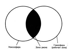 Опасности могут быть реализованы в форме травм или заболеваний только в том случае, если зона формирования опасностей (ноксосфера) пересекается с зоной деятельности человека (гомосфера). В производственных условиях — это рабочая зона и источник опасности (один из элементов производственной среды) (рис. 1.1).