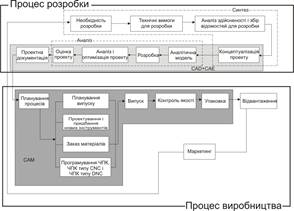 Прямокутники, нарисовані суцільними лініями, представляють два головних процеси, які складають життєвий цикл продукту: процес розробки і процес виробництва.