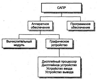 Для реалізації комп’ютерно-орієнтованого підходу до проектування і виробництва потрібно спеціальне апаратне і програмне забезпечення. Ключовим аспектом являється інтерактивне управління формою, тому апаратне і програмне забезпечення для інтерактивного маніпулювання формами відноситься до числу основних компонентів, що складають системи CAD/CAM/CAE. Графічні пристрої і периферійні пристрої вводу-виводу разом з звичайним обчислювальним модулем складають апаратне забезпечення систем CAD/CAM/CAE (рис. 1).