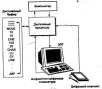 Векторні графічні пристрої, які з’явилися в середині 60-х рр. XX ст., складаються з дисплейного процесора, дисплейного буфера пам’яті і електроно-лучевою трубкою (рис. 2.).