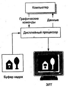 Дисплейний процесор приймає графічні команди від додатку, перетворює їх в точкове зображення, або растр, після чого зберігає растр в розділі пам’яті, який називається буфером кадру (frame buffet)