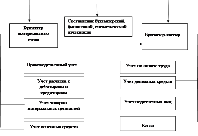 Общее руководство бухгалтерским учетом и отчетностью осуществляет главный бухгалтер. Главный бухгалтер полностью отвечает за состояние дел организационного характера: организацию учета, своевременность отчетности, анализ динамики дебиторской и кредиторской задолженности, финансовых показателей и другие. По функциональной части он непосредственно занимается ведением главной книги, составлением бухгалтерского баланса и финансовой отчетности, ответственен за взаимоотношения с бюджетом, ведет учет внеоборотных активов и капитала предприятия, а также доводит до подчиненных инструкции и указания управленческого характера. Главному бухгалтеру подчиняется бухгалтер материального стола, в функциональные обязанности которого входит ведение производственной бухгалтерии (ведение счетов производственного учета), по расчетам с дебиторами и кредиторами, а также учету товарно-материальных запасов. Кроме того, в штате бухгалтерии имеется бухгалтер-кассир, в обязанности которого входит ведение кассовой книги, выдача заработной платы и авансов, ответственность за движение документов по расчетному счету.