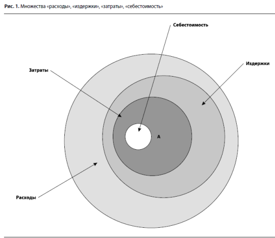 Из рисунка видно, что множество расходов включает в себя множество издержек, которое, в свою очередь, включает в себя все множество затрат. Себестоимость в правильном ее понимании, т.е. производственные затраты на единицу продукции, является непосредственным подмножеством затрат. При этом обозначенное множество А есть не что иное, как затраты или издержки с точки зрения конкретного хозяйствующего субъекта. Именно в пределах этого множества смысловые понятия данных экономических категорий равносильны.