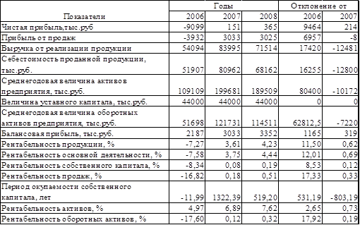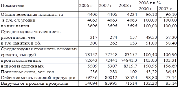 Данные таблицы 1.3 говорят о том, что в 2008 году общая земельная площадь хозяйства уменьшилась на 3,9 % по сравнению с 2006 и 2007 годами при сохранении площади сельхозугодий и пашни. Так же в 2008 году наблюдается сокращение среднегодовой численности по сравнению с 2006 годом на 50,47% и на 42,7% по сравнению с 2007 годом. В том числе и сократилась среднегодовая численность работников, занятых в сельском хозяйстве по сравнению с 2006 годом на 49% и 41,6% по сравнению с 2007 годом. Это связано с тем, что ООО «Агрофирма» начала уделять больше внимания подбору квалифицированных кадров, их обновлению. Среднегодовая стоимость основных фондов увеличивается на 6,4% по сравнению и с 2006 годом и 6,96% по сравнению с 2007 годом. Это связано с приобретение и введением в эксплуатацию новых основных средств в 2007 году, а в 2008 – в связи с их дооценкой. Поголовье скота резко сокращается. В 2008 году по сравнению с 2006 уменьшение произошло на 56,78%, а по сравнению с 2007 годом – на 36,43%. Это связано с тем, что руководство ООО «Агрофирмы «Александровская» решило постепенно ликвидировать отрасль животноводства, т.к. она является малодоходной. Себестоимость валовой продукции снижается на 26,86% по сравнению с 2007 годом и на 1,2%, что свидетельствует о снижении издержек производства, а значит, и о повышении эффективности производства. Однако мы наблюдаем снижение выручки от продаж по сравнению с 2007 годом 14,86%. Но если сравнивать этот же показатель в 2008 году с 2006 годом, то мы наблюдаем увеличение на 32,2%. Такими перепады связаны с изменениями цен на продукцию, выпускаемую в ООО «Агрофирма».
