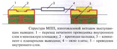 В отличие от других методов, метод выступающих выводов не имеет каких-либо ограничений по максимальному количеству слоев. Но сосредоточение печатных проводников в узких переплетах перфорированных окон создает большие перекрестные помехи и, тем самым, ограничивает трассировочные возможности печатных узлов. Наряду с этим недостатком, следует принять во внимание затруднения в формовке и закреплении выступающих выводов на поверхности платы в пределах периметра окна.