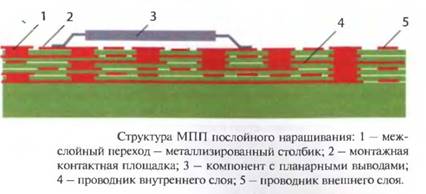 Изготовление МПП этим методом заключается в последовательном чередовании слоя изоляции и металлизированного слоя печатного рисунка. Соединения между проводящими элементами печатных слоев производятся гальваническим наращиванием меди в отверстиях слоя изоляции. Типичная структура МПП, реализуемая этим методом, показана на рис. 1.20.