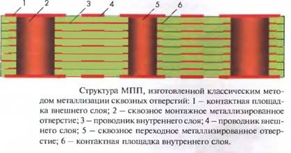 Процесс изготовления МПП методом электрохимической металлизации сквозных отверстий состоит в изготовлении отдельных внутренних слоев химическим методом, прессовании слоев в монолитный пакет, сверлении сквозных отверстий и их металлизации. При сверлении на стенках отверстий вскрывают торцы контактных площадок внутренних слоев. Соединения их друг с другом и с контактными площадками наружных слоев получаются за счет металлизации отверстий.