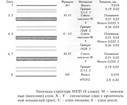 Метод металлизации сквозных отверстий, по-существу единственный метод создания конструкций с наиболее оптимальной электрической структурой, обеспечивающей надежную передачу наносекундных импульсов и распределение питания между активными элементами. Такие конструкции МПП позволяют выполнить печатные цепи как полосковые линии передач и создают эффективное экранирование одной группы цепей от другой. Показанная для примера на рис. 1.24 типичная структура 8-слойной МПП содержит 4 сигнальных слоя и 2 слоя питания. Цепи сигнальных слоев имеют ортогональное расположение печатных проводников, т. е. преимущественное направление вдоль одной из осей координат: X или У. Слои питания представляют собой целиковую фольгу или металлическую сетку с освобождениями в местах сквозных металлизированных отверстий. В точках соединения металлизированного отверстия с цепью внутреннего слоя выполняют контактную площадку. Слои питания одновременно выполняют роль электрических экранов.