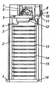 В большинстве холодильных шкафов машинное отделение расположено над охлаждаемым объемом. Все узлы холодильной машины установлены на теплоизолированной плите. На ее верхней поверхности размещены холодильный агрегат с фильтром-осушителем, теплообменник, терморегулирующий вентиль и шкаф электрооборудования, на нижней – воздухоохладитель, лампа освещения и микропереключатель.