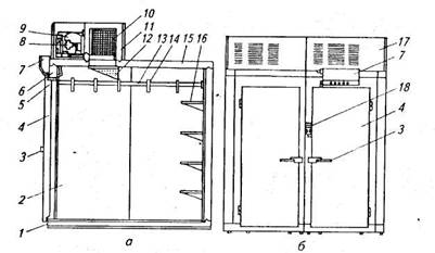 В камере КХН-1-8,0 (рис.3) замороженные продукты хранят на полках-решетках, а мясные туши подвешивают на крюки. Полки-решетки можно регулировать по высоте. В камере КХН-1-8,0К продукты хранят в передвижных контейнерах (размерами 800х700х1700 мм) с колесами.